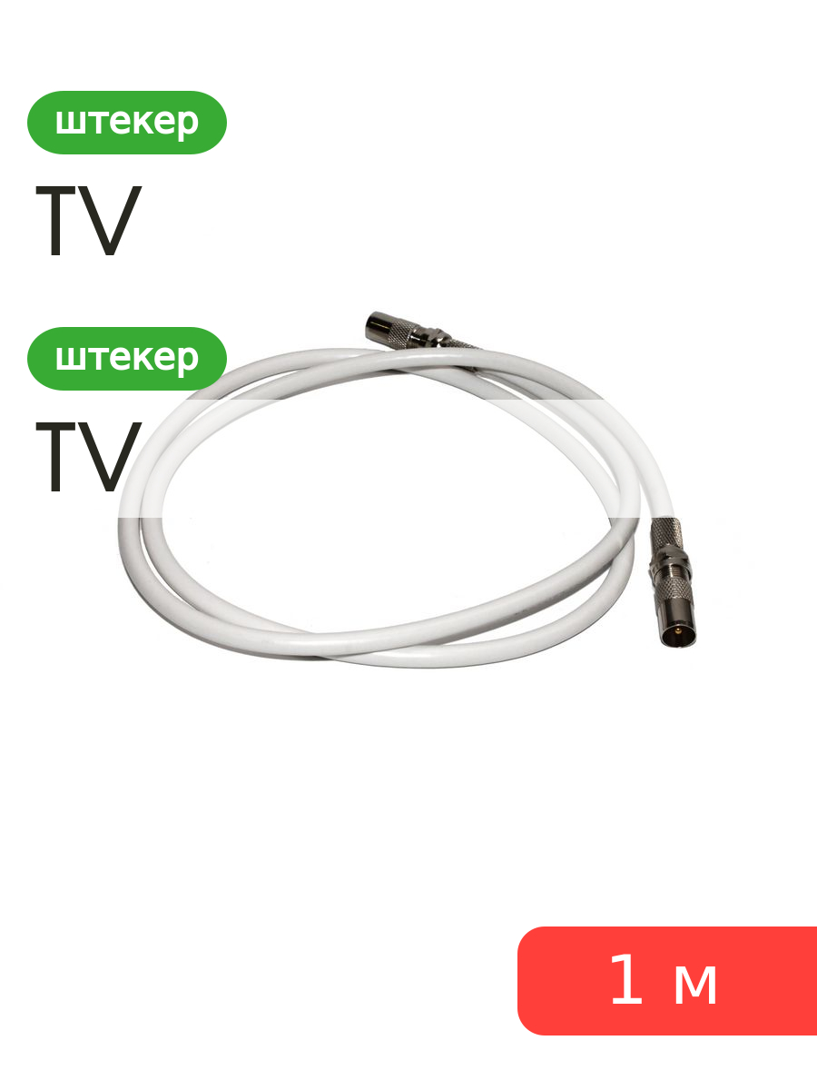 Телевизионный шнур TV штекер - TV штекер 1м подключает устройства (в основном телевизоры). имеющие разъем TV. Он предназначен для передачи аналоговых видео и аудио сигналов от антенны к телевизионному оборудованию. которое используется в быту. На одном конце шнура располагается штекер TV. на другом – штекер TV. Благодаря этому данный шнур очень удобно использовать в качестве удлинителя для ТV-кабеля. Длина данного шнура составляет 1 метр.