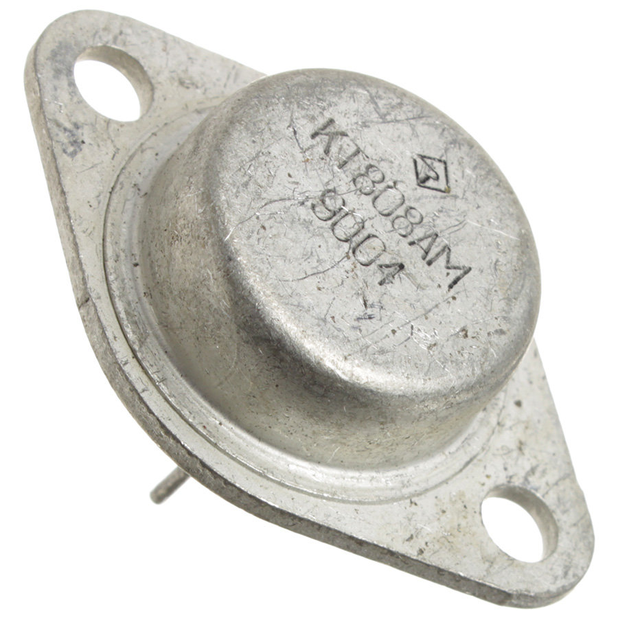 КТ808АМ Транзисторы КТ808АМ кремниевые мезапланарные структуры n-p-n высоковольтные, переключательные. Предназначены для применения в переключающих устройствах, генераторах строчной развертки, электронных регуляторах напряжения. Используются для работы в узлах и блоках электронной аппаратуры общего назначения. Выпускаются в металлическом корпусе со стеклянными изоляторами и жесткими выводами.