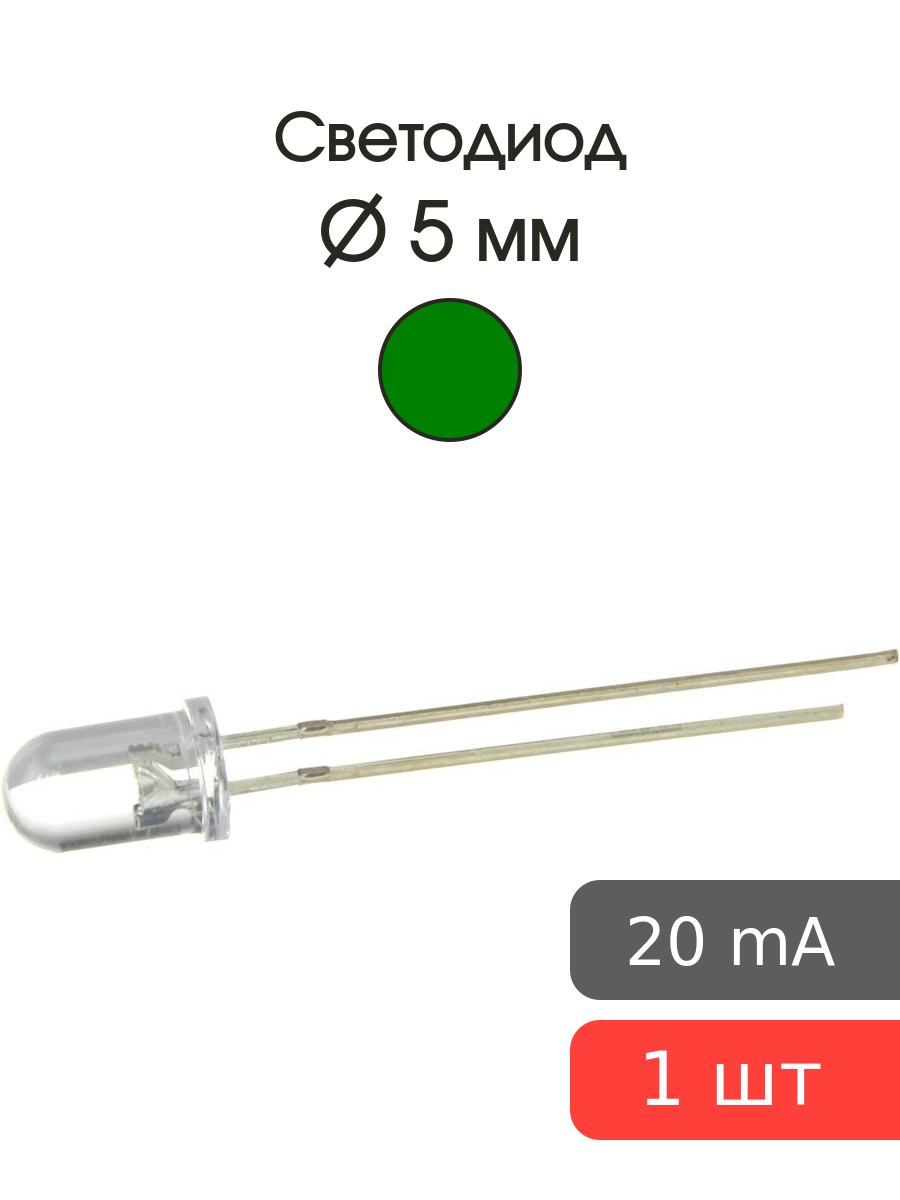 Светодиод 5мм, цвет зеленый, линза