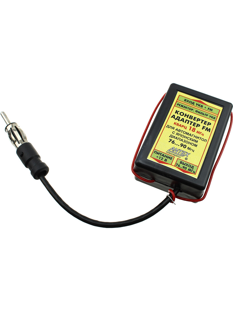 штекер антенны вставьте в гнездо антенны конвертера, а штекер конвертера в гнездо антенны автомагнитолы, затем присоедините провод питания конвертера к цепи питания магнитолы +12 В. Включите магнитолу и настройте на радиостанции УКВ ЧМ и FM диапазонов.