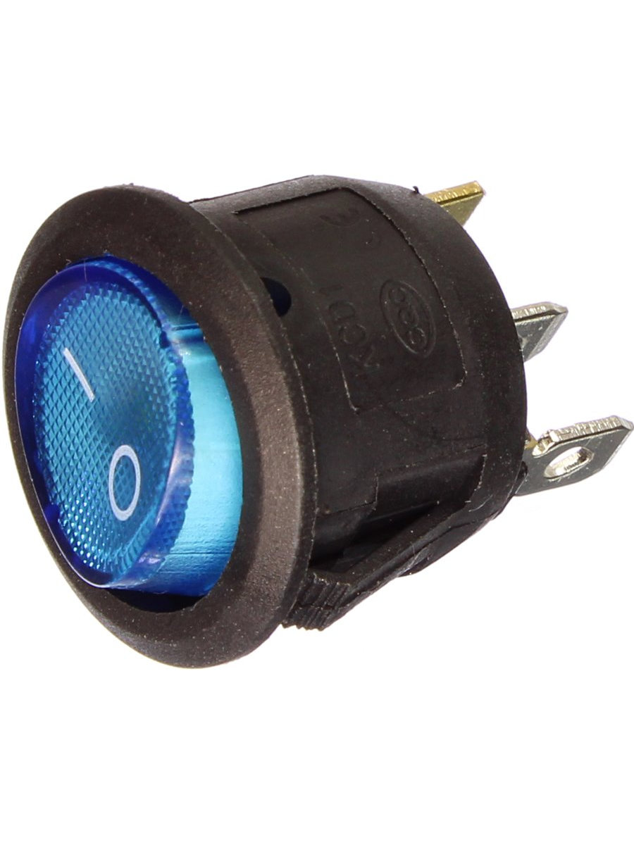 Выключатель круглый синего цвета с подсветкой, размер 23мм, 3 контакта, 2 положения.