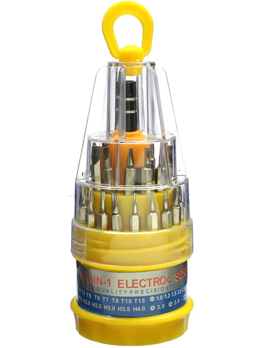 Насадки : • Шлицевая (-) 7 шт: 1.0, 1.3, 1.5, 2.0, 2.5, 3.0, 4.0; • Крестовая ( ) 4шт: PH000, PH0, PH1, PH2 ; • 6-лучевая звезда 8шт: Т3, T4, T5, T6, T7, T8, T10, T15 ; • Шестигранник H 6шт: 1.5, 2.0, 2.5, 3.0, 3.5, 4.0 ; • Трехгранник 3.0 ; • Обработчик отверстий (конический надфиль) 1.0 ; • 5-лучевая звезда 2.0 ; • 3-х лучевая (Y) 3.0 ; • Т-образная 2.6