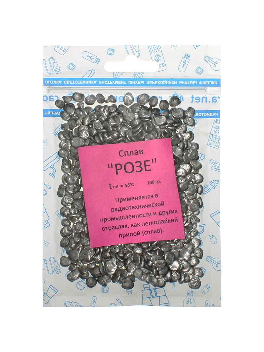 Температура плавления 95 °C. Сплав Розе похож на Сплав Вуда. но отличается от него меньшей токсичностью ( не содержит кадмия ). Используется в электрических предохранителях, полупроводниковой технике, для пайки деталей чувствительных к перегреву, алюминия, алюминия с медью и ее сплавами в монтажных соединениях, сплавов алюминия между собой, для пайки и лужения меди, никеля, латуни, бронзы, медных и медно-никелевых сплавов с посеребренной керамикой, посеребренных деталей, ювелирных изделий.