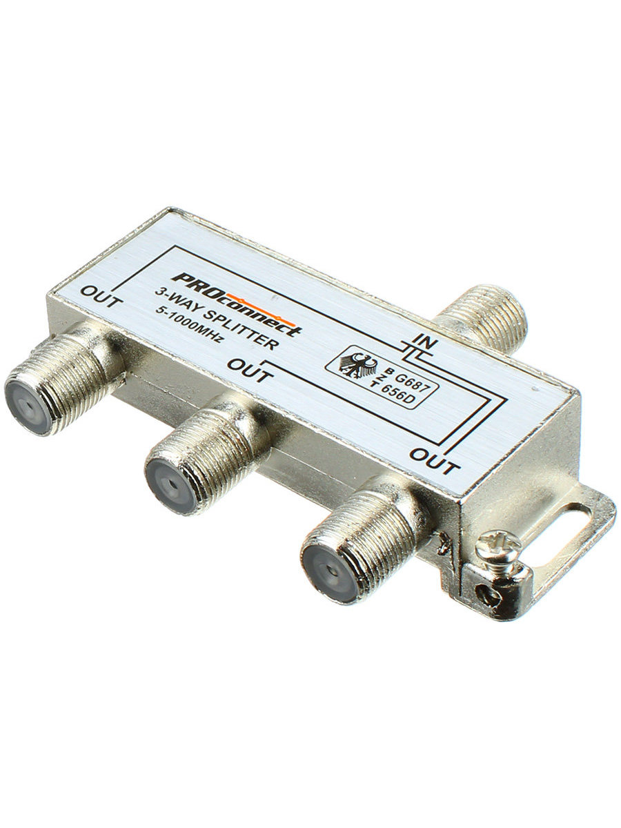 Телевизионный разветвитель незаменим в любой системе эфирного телевидения, а также в бытовых условиях, когда необходимо подключить к одной антенне несколько телеприемников. Делитель ТВ на 3 выхода под F-разъем предназначен для деления телевизионного сигнала, идущего от антенны к оборудованию. равномерно на число выходов. Данный ТВ краб на 3 выхода под F разъём PROCONNECT имеет три выхода, т. е. сигнал. проходящий через сплиттер. делится на три части. Кабель подключается к этому делителю с помощью F-разъемов. Делитель подходит для сигналов. имеющих диапазон частот 5-1000 МГц. что соответствует эфирному телевидению. Делитель ТВ PROCONNECT — это качественное и надежное решение для систем эфирного телевидения. имеющее высокие технические характеристики и выгодную цену.