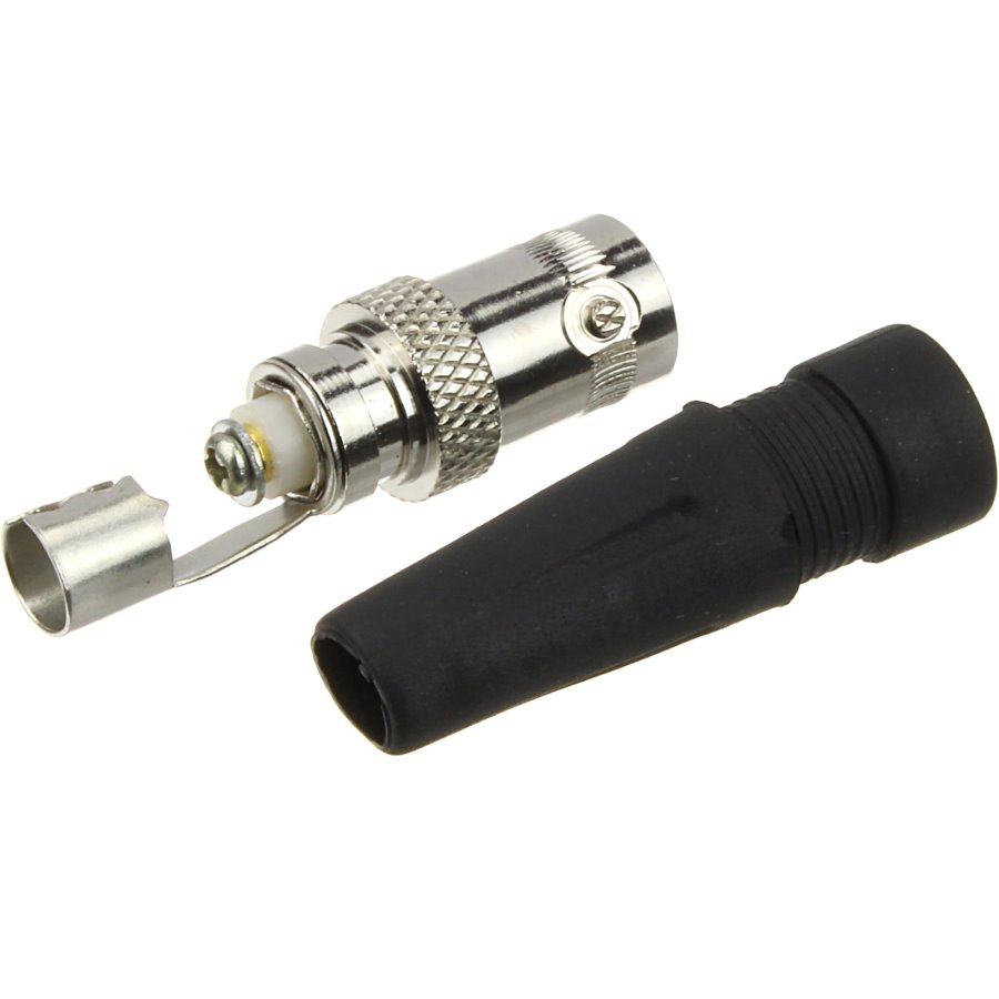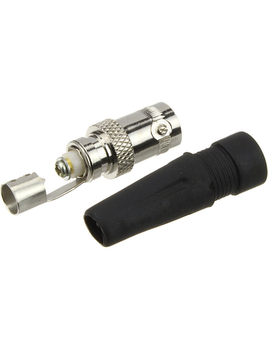РАЗЪЁМ гнездо BNC под винт с колпачком предназначен для подключения коаксиального кабеля c волновым сопротивлением 50 или 75 Ом, диаметром до 7мм, к видеокамерам, видеорегистраторам, мониторам и другим радиоэлектронным устройствам. BNC-коннектор (BNC сокр. от Bayonet Neill Concelman) под винт - электрический разъем с байонетной фиксацией закрепляется на кабеле зажимом с помощью винта центрального контакта (центральная жила - под винт, оплетка - обжимается). Этот способ крепления значительно проще и быстрее, чем пайка, но его надежность и качество соединения остаются на неизменно высоком уровне. Пластиковый колпачок защищает соединения и предотвращает кабель от перегиба в месте крепления к разъему. BNC-разъем изготовлен из материалов: