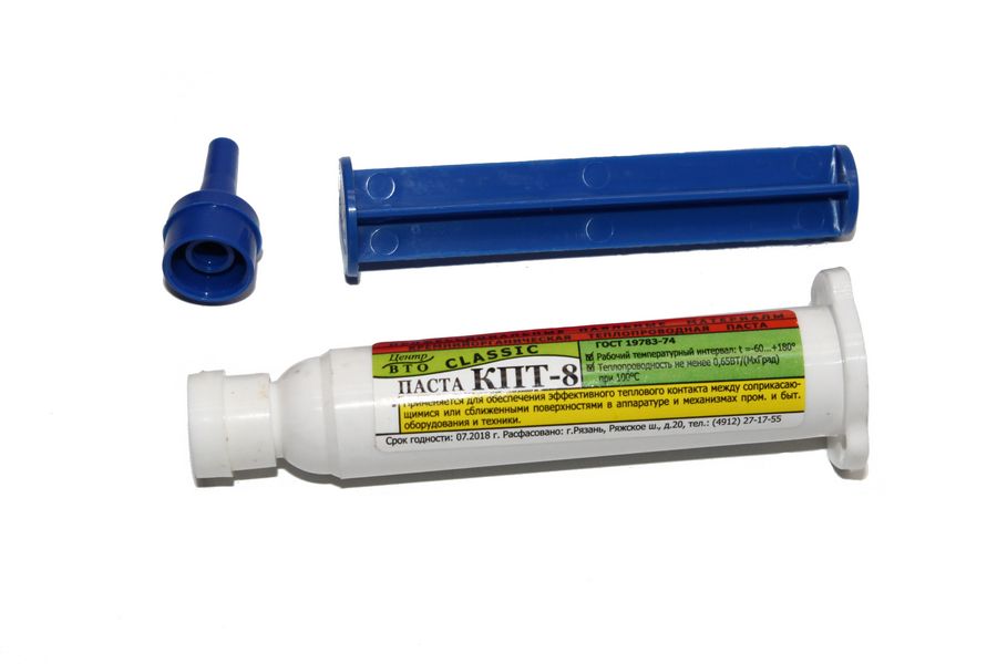 «Паста теплопроводная КПТ-8» - высоковязкая теплостойкая белая масса. полученная путем загущения полидиметилсилоксановой жидкости. химически инертна. взрывобезопасна. не горюча. не оказывает раздражающего и общетоксического действия на организм. Обеспечивает эффективный тепловой контакт между двумя соприкасающимися или сближенными поверхностями в аппаратуре и оборудовании различного назначения. бытовой технике. значительно уменьшает контактное тепловое сопротивление и рекомендуется для применения в интервале рабочих температур от -60 до +180?С.
