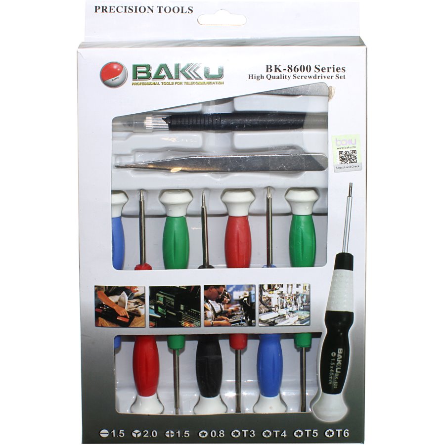 8 отверток: • Шлицевая (-) 1.5х42мм; • Крестовая (+) 1,5х42мм; • 6-лучевая звезда 8шт: Т3, T4, T5, T6 ; • 5-лучевая звезда 0,8х42мм ; • 3-х лучевая (Y) 2.0х42мм ; 2 пинцета; обработчик