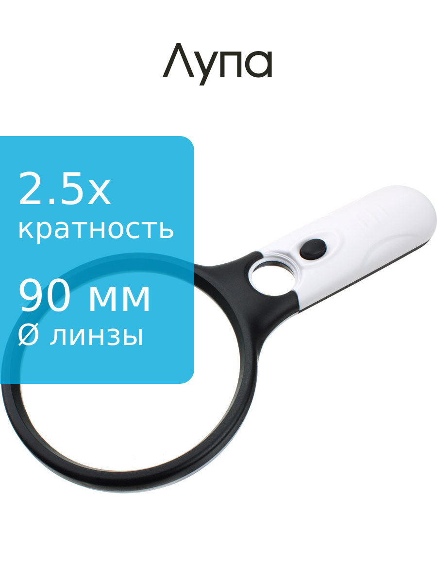Лупа 90мм 2,5х 22мм 45х подсветка 3свд 3бат ААА