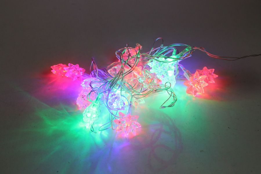 Украшение интерьера - светодиодная гирлянда с заменяемыми лампами в виде звезд. Количество светодиодов - 20 штук. Работает от сети 220В. Длина гирлянды - 3,8м. Цвет свечения - разноцветный.