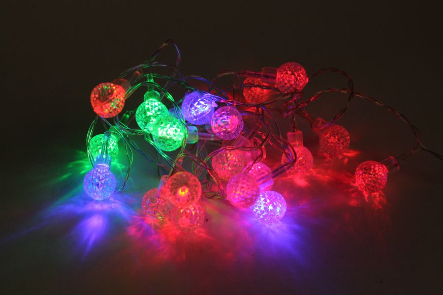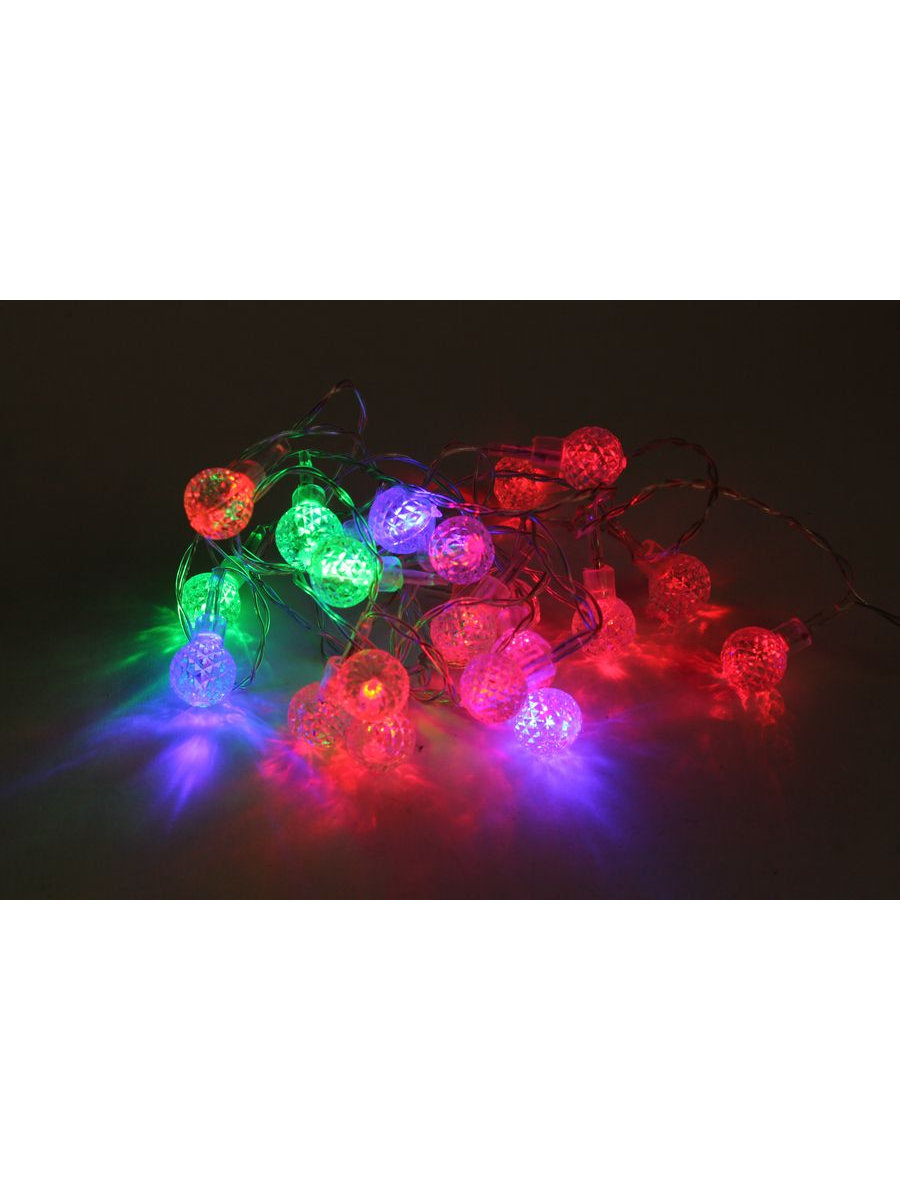 Украшение интерьера - гирлянда с заменяемыми лампами в виде шаров. Количество светодиодов - 20 штук. Работает от сети 220В. Длина гирлянды - 3,8м. Цвет свечения - разноцветный.