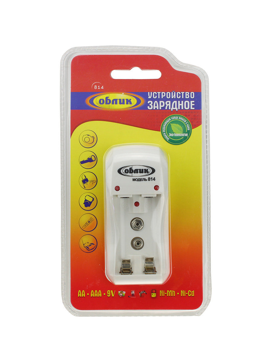 Зарядное устройство Облик 814 способно заряжать один или два аккумулятора типа АА/ААА Ni-Cd / Ni-Mh, а также аккумулятор 9V Ni-Mh