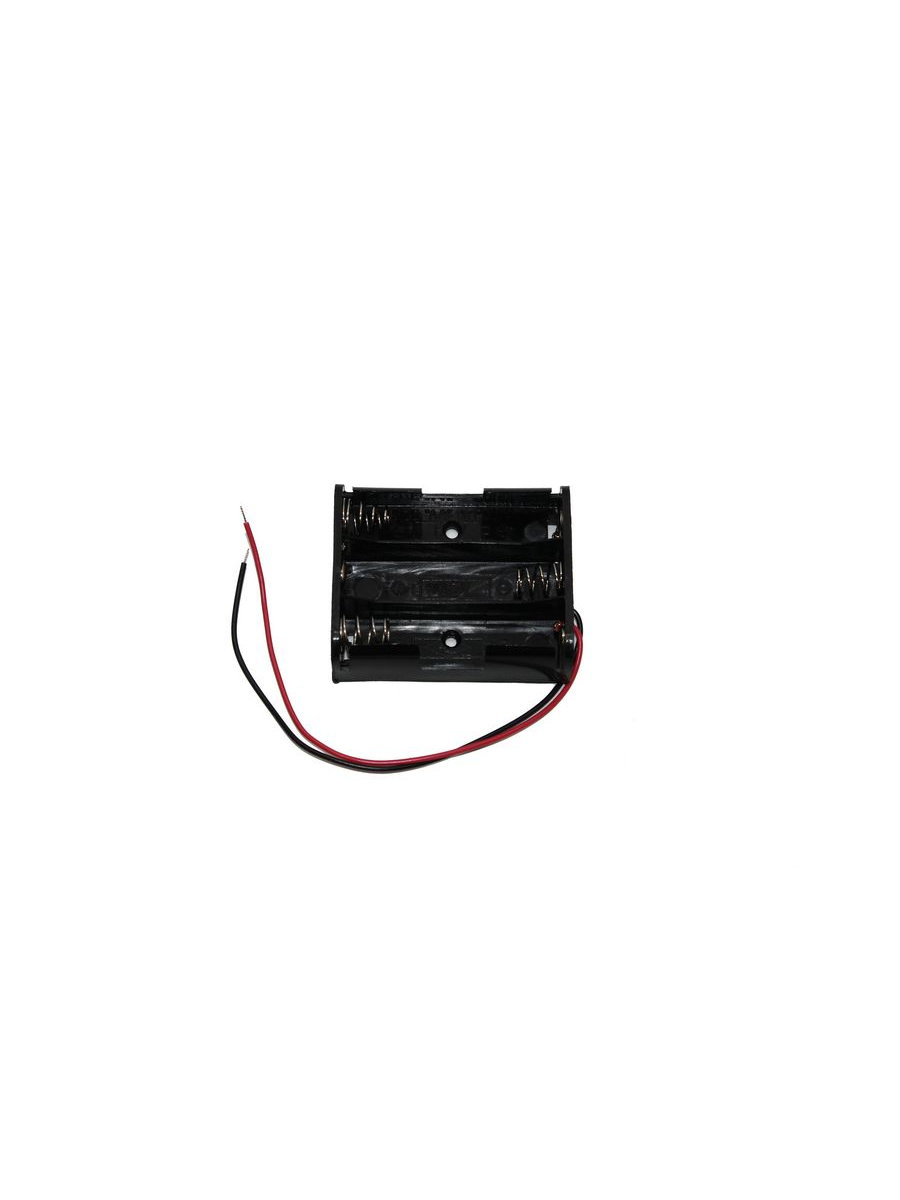Батарейный отсек (держатель батареек) для трех батарей типоразмера АА с контактными проводами предназначен для подключения питания в различном оборудовании (в том числе в бытовых устройствах, игрушках и радиоуправляемых моделях). В целях ускорения и удобства монтажа держатель выполнен с двумя проводами (красного и черного цвета) длиной по 13 см, т.е. не требует пайки контактов. Окончания проводов подготовлены для дальнейшего монтажа: зачищены и обложены оловом. Суммарное напряжение при использовании 3-х батареек на 1.5 В - составит 4,5 В.