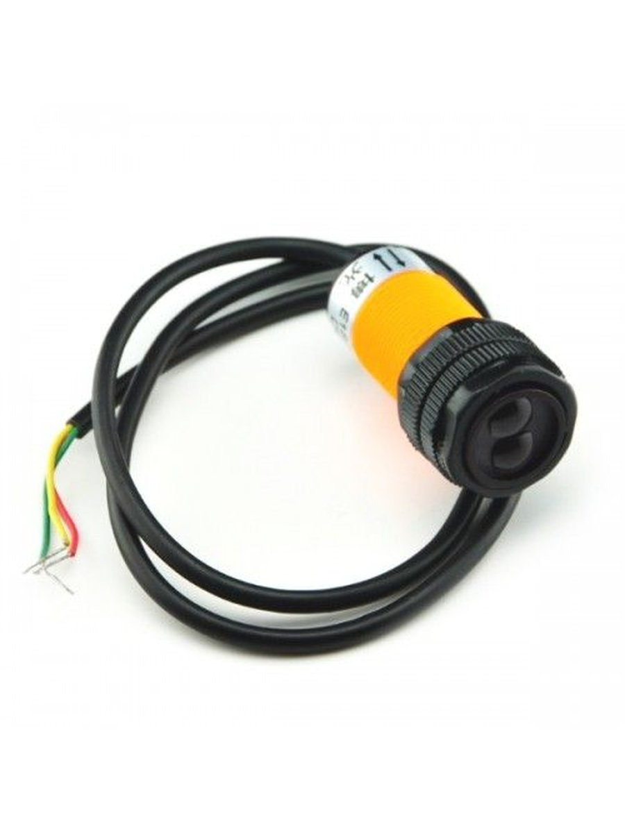 Датчик для определения наличия препятствия. Не измеряет расстояние, а только сигнализирует о наличии препятствия на заранее заданном расстоянии. Расстояние срабатывания задаётся регулировочным винтом на торце датчика. Работает в инфракрасном диапазоне, поэтому, отлично работает со всеми типами поверхностей.