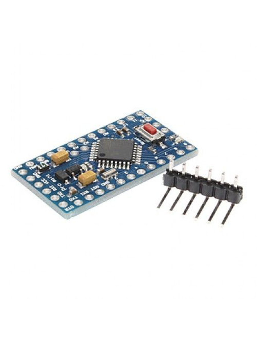Pro Mini - это устройство на базе микроконтроллера ATmega328. В его состав входит: 14 цифровых входов/выходов (из них 6 могут использоваться в качестве ШИМ-выходов), 8 аналоговых входов, кварцевый резонатор, кнопка сброса и контактные площадки для впаивания разъемов. Шестиконтактный разъем может служить для питания и взаимодействия с платой через USB посредством FTDI-переходника либо макетной платы Sparkfun.