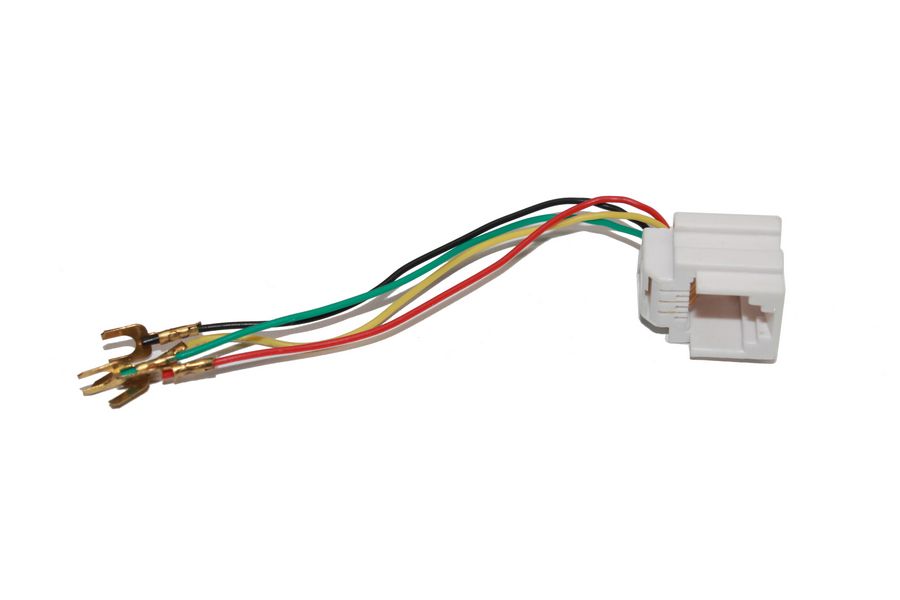 Гнездо 6P-4C с проводами 82мм пластик 623K предназначено для подключения кабелей телефонной линии к телефонной аппаратуре и другим телекоммуникационным устройствам с разъемами такого типа. Такое гнездо имеет отведенные от контактов четыре провода длиной 82 мм с вилочными наконечниками для удобного монтажа внутри оборудования. Разъем изготовлен из легкого и прочного пластика и имеет 6 посадочных мест и 4 контакта. На контакты нанесен слой технического золота для безупречной пропускной способности разъема. Данное гнездо используют при сборке телефонного оборудования или при монтаже модульных розеток.