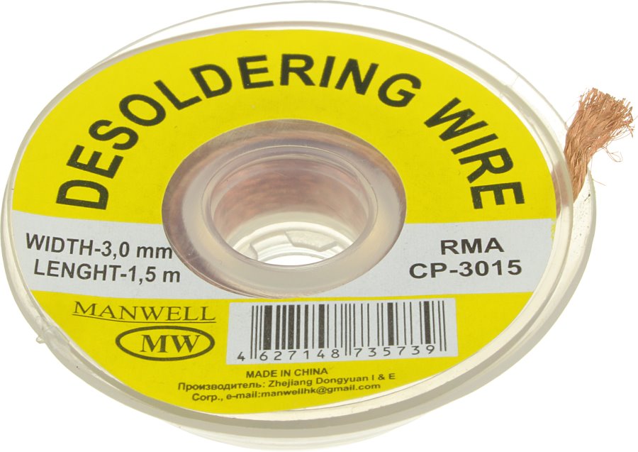 Лента для удаления припоя при выпаивании радиокомпонентов представляет собой оплётку из тонкой медной проволоки. покрытой специальным флюсом (диаметр проволоки – 3 мм.. а длина – 1.5м.). Создана для облегчения труда паяльщиков. так как после её применения отпадает необходимость в чистке контактных площадок платы. Очень легка в применении: достаточно просто приложить оплётку к расплавленному припою. и она возьмёт его на себя. Важно помнить. что паяльник при этом должен находиться в области пайки.