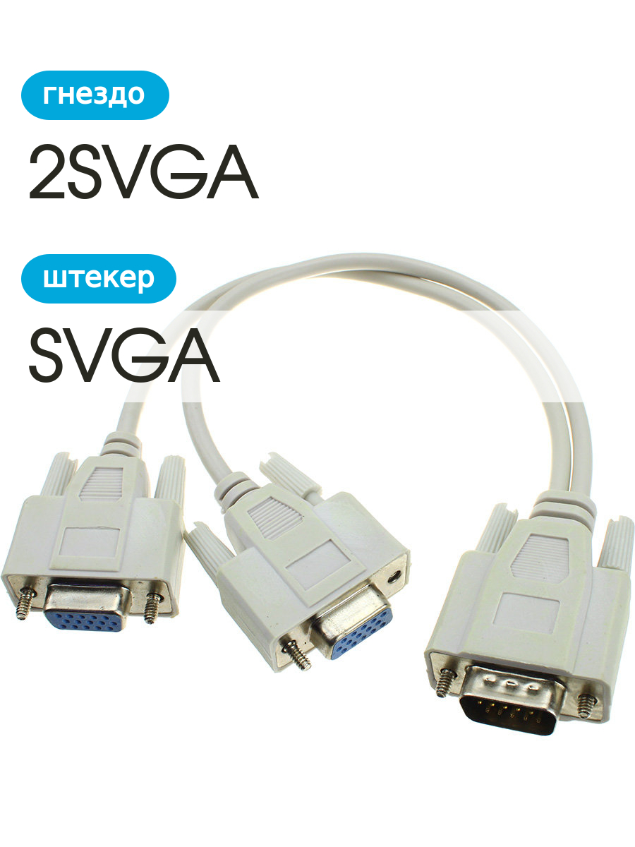 ПЕРЕХОДНИК шт.VGA - 2гн.VGA (провод) серый REXANT предназначен для подключения двух устройств через один разъем источника аналогового видеосигнала. Используется для подключения следующих устройств: компьютеры и ноутбуки, мониторы, плазменные и ЖК телевизоры, AV ресиверы, проекторы и другие видеоустройства, имеющие соответствующие разъёмы. С одной стороны переходника на проводе расположен разъем штекер VGA, а с другой на проводе 2 гнезда VGA. На контакты разъемов нанесен слой золота по технологии вакуумного напыления, обеспечивающий повышение качественных показателей изображения, а также отсутствие помех при передаче сигналов.