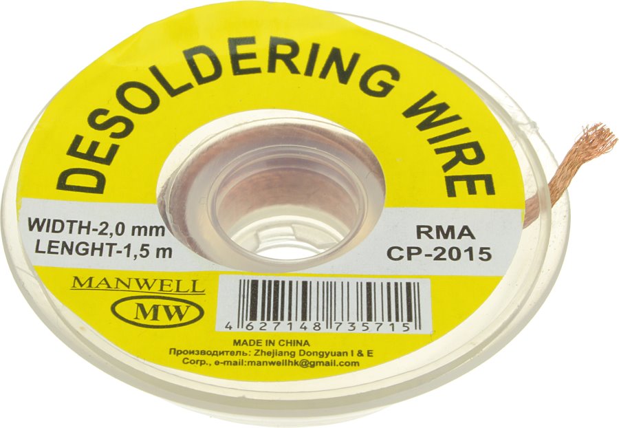 - оплётка из тонкой медной проволоки, покрытая специальным флюсом (диаметр проволоки ~ 3 мм, длина ~ 1.5м.). Отпадает необходимость в чистке контактных площадок платы. Применение: приложить оплётку к расплавленному припою, и она возьмёт его на себя. При этом паяльник должен находиться в области пайки.