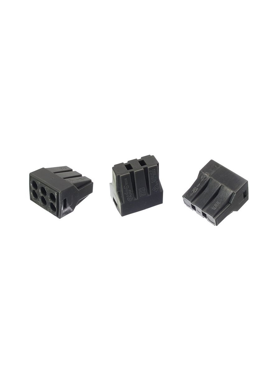 Клемма 773-306 для распределительных коробок 6 проводников сечение 1,0-2,5 кв.мм. - позволяет с лёгкостью, а главное безопасно и мгновенно (на то они и экспресс) соединить 6 проводов между собой (алюминиевые и медные как одножильные, так и многожильные). А помогут в этом нехитром деле заключённые в них самозажимные медные контакты. Достаточно просто вставить жилу кабеля или провода в клемму и самозажимной контакт надежно зафиксирует соединение. Диаметр соединяемых проводов должен составлять в сечении от 1,0 до 2,5 мм2. Оболочка из черного пластика в совокупности с изолирующей пастой внутри делает контакт изолированным.