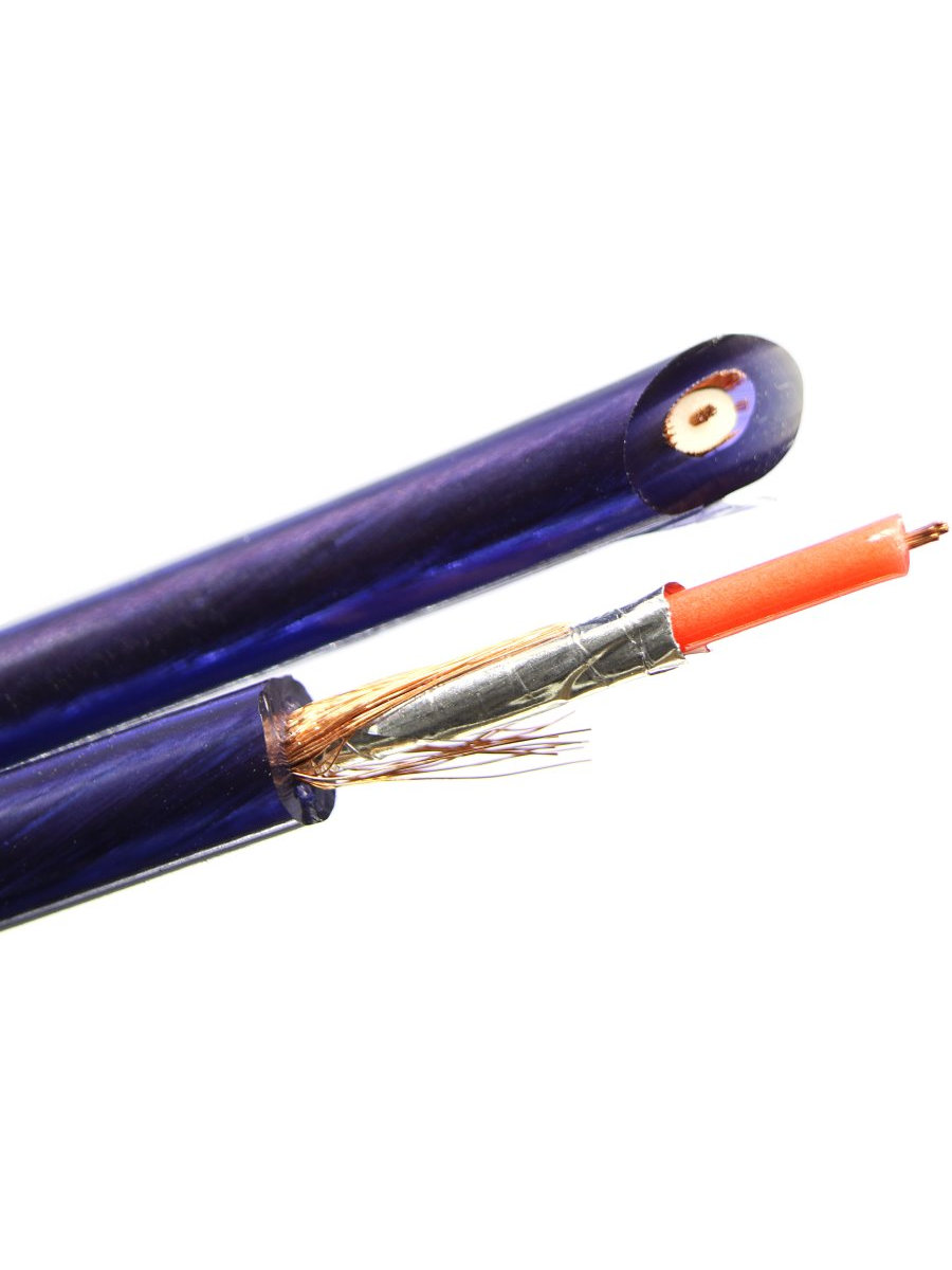 Состоит из двух медных жил, покрытых двумя экранами, внешний изолятор сине-прозрачного цвета.