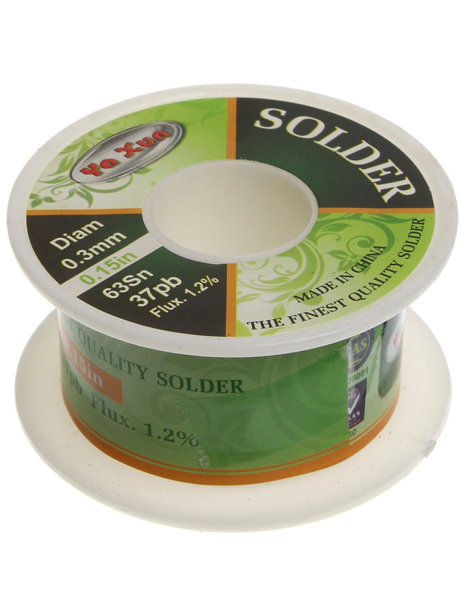 Диаметр припоя составляет 0.3 мм, вес: 45 г., температура плавления: 183 C