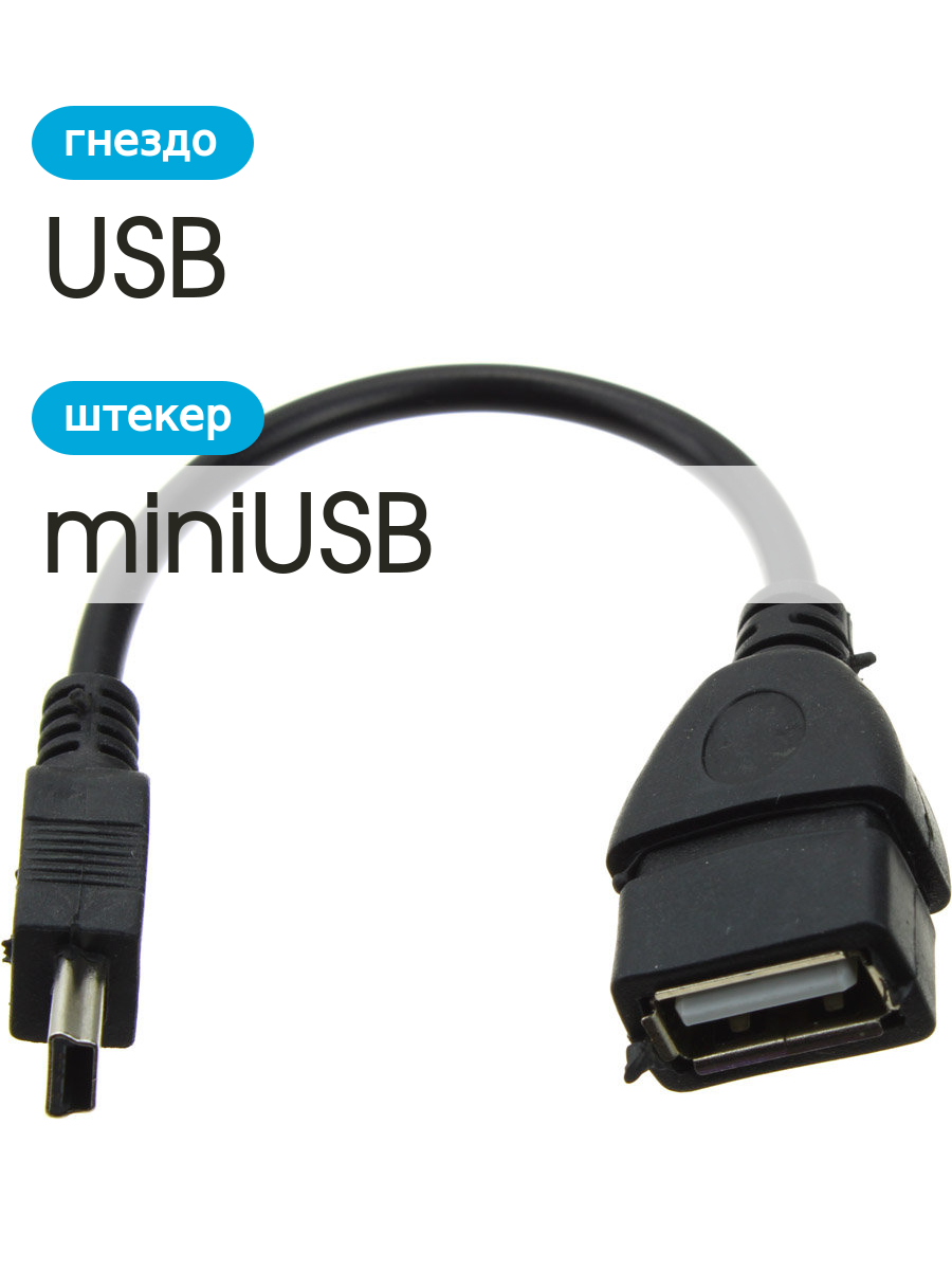 Применяется для подключения USB флэшек к автомагнитолам, электронным книгам и др. с разъёмами miniUSB