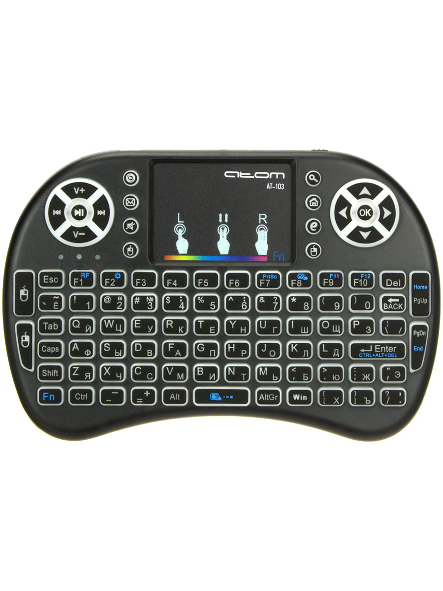 Беспроводная мини-клавиатура «АТОМ» АТ-103 за счет своего стильного дизайна и яркой цветной упаковки и необычного вида, заметно выделяется на полке и сразу заинтересует покупателя. «АТОМ» АТ-103 предназначена для дистанционного управления мультимедийными устройствами, позволяет управлять курсором на экране с помощью встроенного тачпада. Поддерживает системы такие как: Android, Windows, Mac OS, Linux.