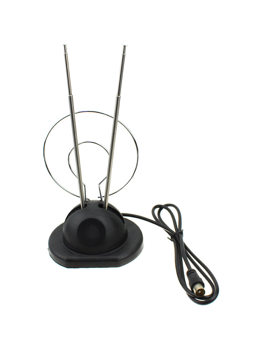Антенна комнатная МВ(пассивная). Антенна предназначена для приема телевизионных программ в метровом диапазонах. Антенну необходимо установить на телевизор, или непосредственно рядом с ним. Вставить штекер в гнездо телевизора. Поворотом антенны, изменением длины телескопических плеч и угла между ними, добиться уверенного приема программ.