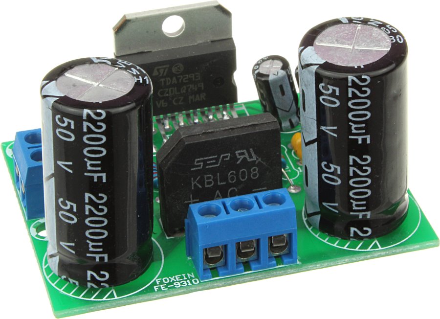 Усилитель мощности звука на микросхеме TDA7293, моно, максимальная выходная мощность 1x100 Вт. Класс усилителя AB. Особенностью усилителя является возможность питания от переменного тока напряжением 12 - 32 В, то есть можно подать питание прямо с выхода понижающего трансформатора. Для этого на плате установлен диодный мост и большие фильтрующие конденсаторы.