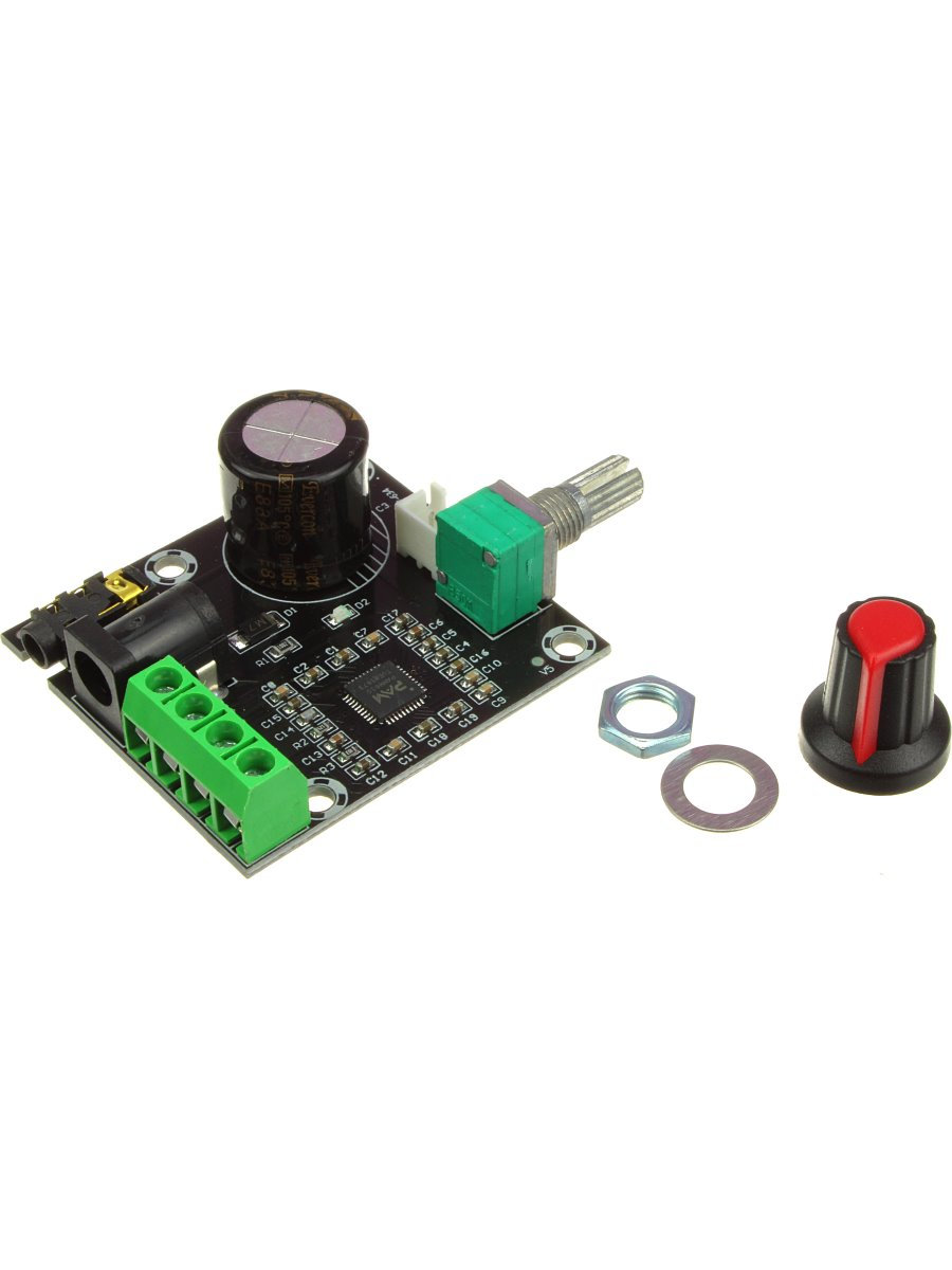 Стерео аудио усилитель мощности PAM8610 — это небольшой оконечный усилитель сигнала звуковой частоты класса D, с выходной мощностью по 15 Вт на каждый канал и низким уровнем шума. Выход усилителя подключается непосредственно к колонкам для воспроизведения звука. Усилитель построен на базе чипа PAM8610, который отличается высокой производительностью, малыми габаритами, наличием системы подавления шумов и защиты от перегрева, и короткого замыкания. Данные чипы используются в плоских телевизорах, акустических системах, DVD-плеерах, игровых приставках и т.д. На плате выводы чипа VOLUME (вход напряжения регулировки усиления), VREF (максимальное напряжение регулировки усиления) и AVDD (выход 5 В постоянного тока) соединены между собой, следовательно, установлен максимальный коэффициент усиления.