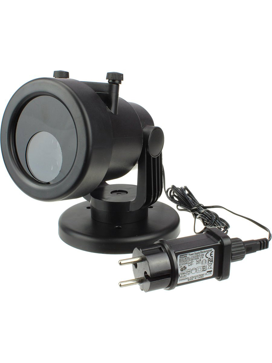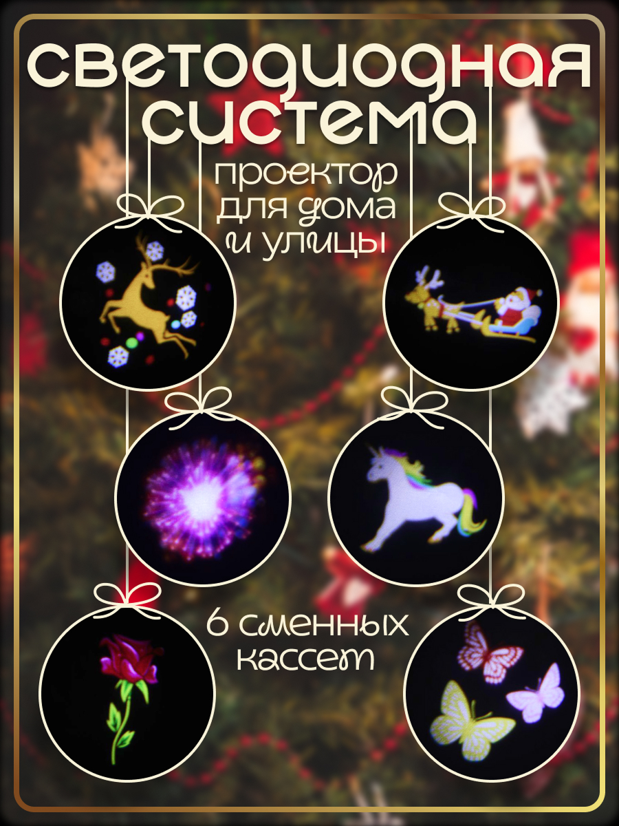 Универсальный уличный проектор для создания праздничной атмосферы. Проецирует цветные анимированные сюжеты (Дед Мороз, елки, подарки и др.) на фасад дома или любую ровную поверхность.