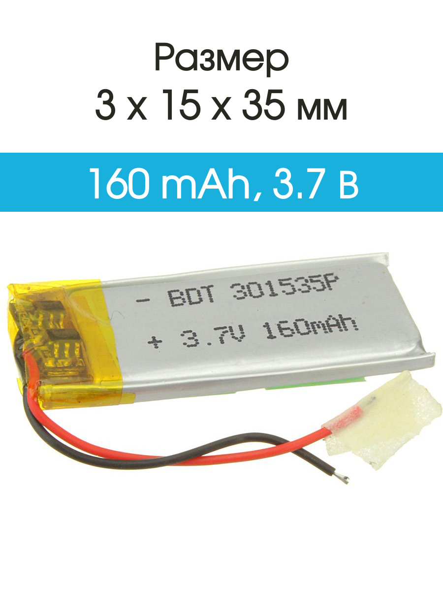 Аккумулятор • Химический тип - Li-Po • Напряжение 3,7В • Ёмкость - 160mAh • Высота 3мм • Ширина 15мм • Длина 35мм