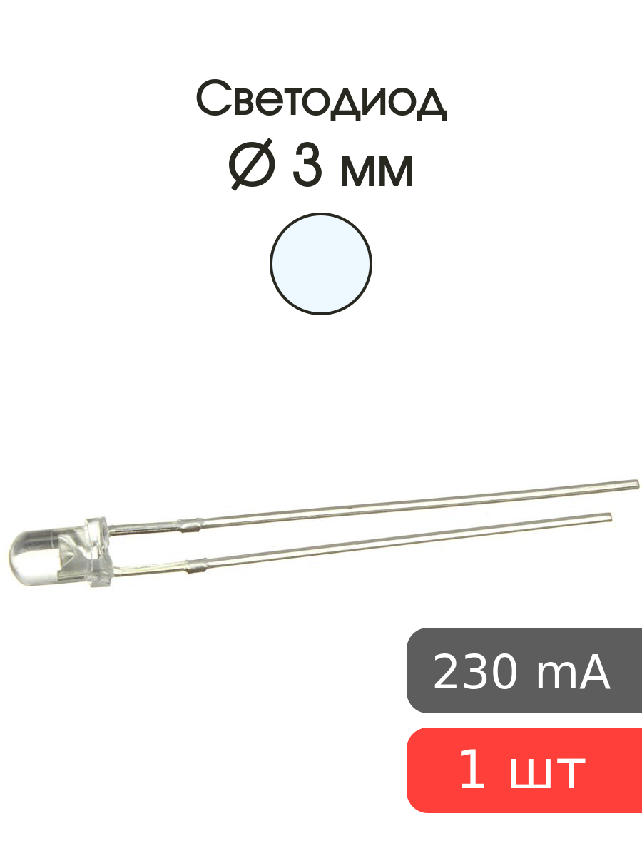Светодиод 3мм, цвет белый теплый, прозрачная линза, 3V