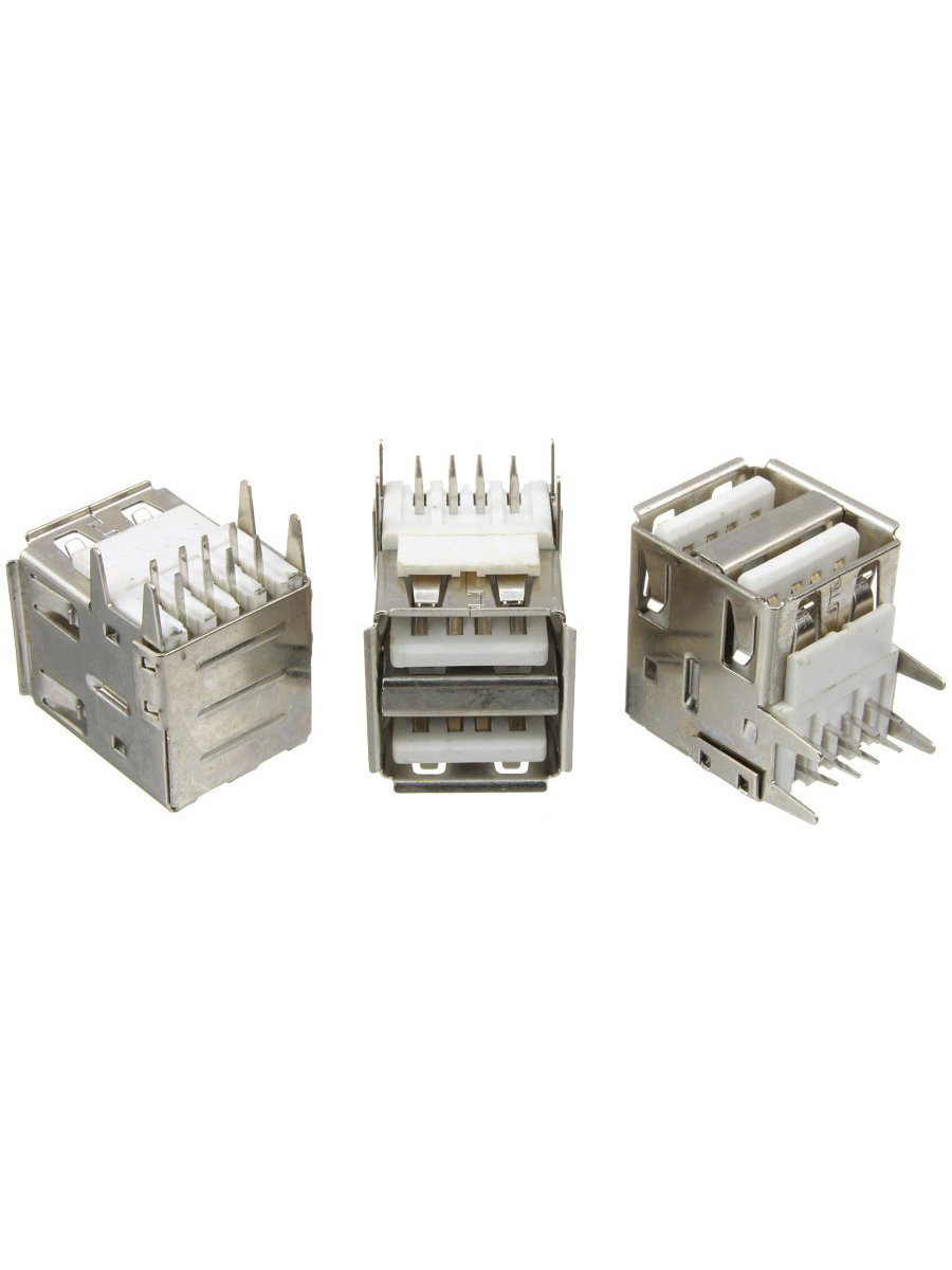 РАЗЪЁМ гнездо на плату 2хUSB-A (металл) предназначен для подключения периферийных и портативных устройств к компьютерной технике с помощью кабелей формирующих интерфейс между USB-устройствами и программно-управляемым USB-контроллером. Такой разъем монтируют на платы корпусов компьютеров, ноутбуков и других устройств, имеющих шину USB. Электрические характеристики: