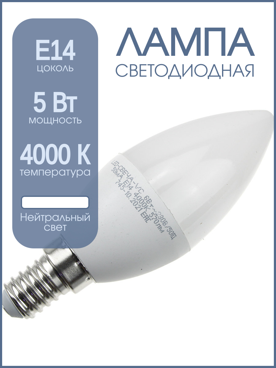 Лампа светодиодная LED-Свеча 5Вт 230В E14 4000К 470лм Ecola C4TV50ELC филамент120 p130 p120 p