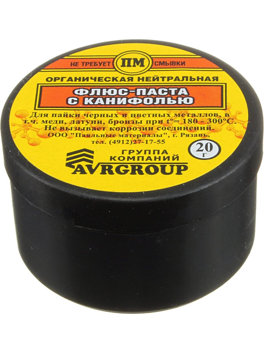 Флюс паста с канифолью. Для пайки черных и цветных металлов, в том числе меди, латуни, бронзы при t-180-300*C. Не вызывает коррозии соединений. Не требует смывки.