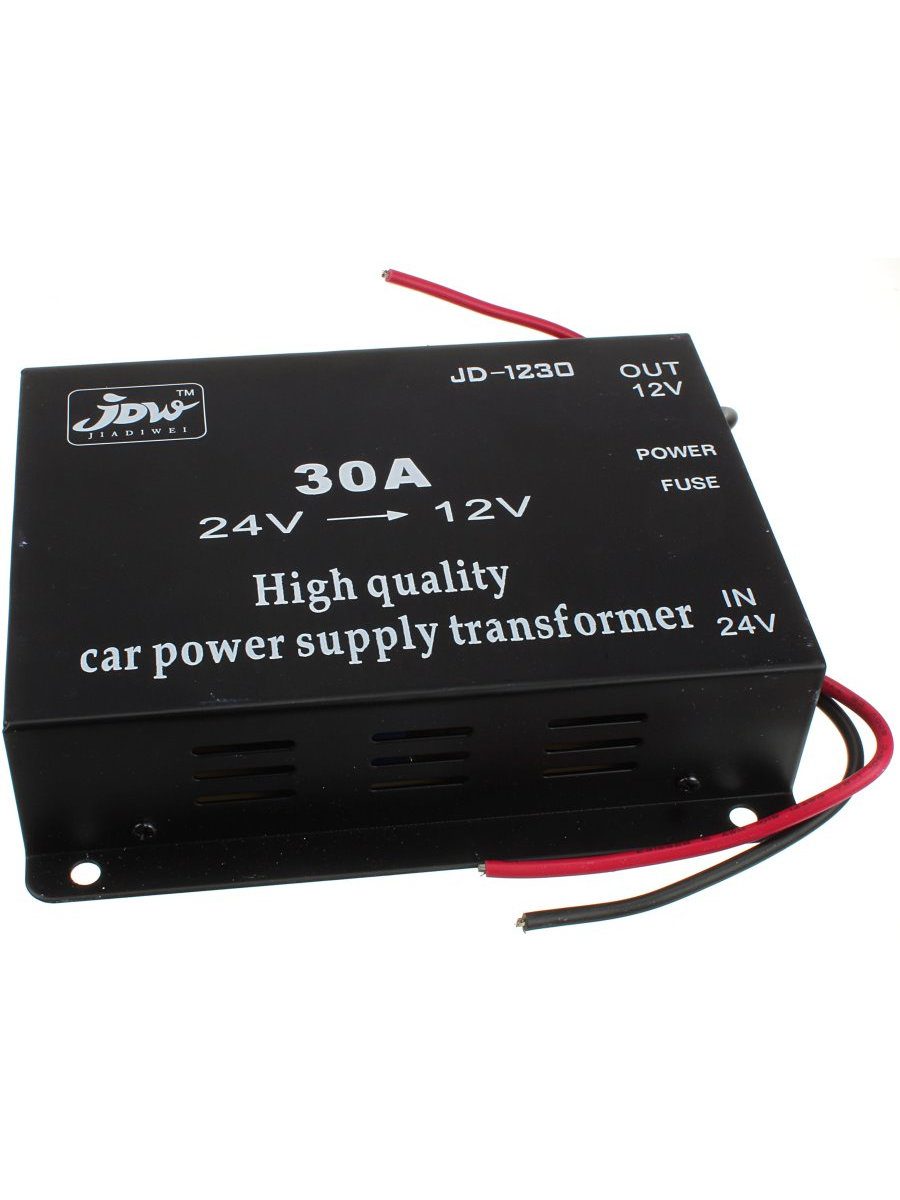 Понижает напряжение бортовой сети грузовых автомобилей с 24 Вольт до 12 Вольт с максимальным током нагрузки 30 Ампер