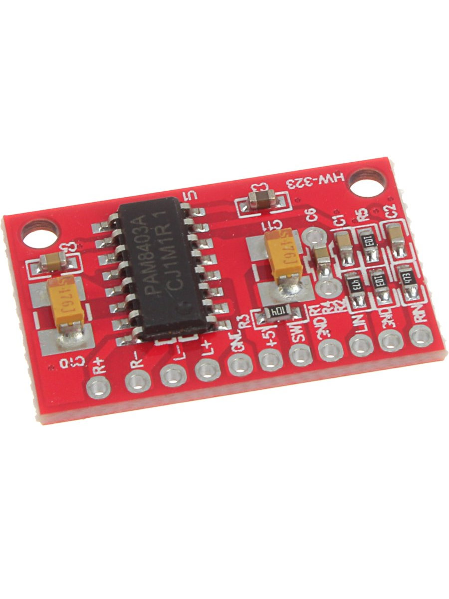 Микросхема PAM8403 представляет собой усилитель D-класса, эффективность которого намного выше аналоговых (АВ-класса). Низкий коэффициент нелинейных искажений позволяет получить высокое качество звучания при достаточной выходной мощности. Применяется в портативной электронике с автономным питанием.