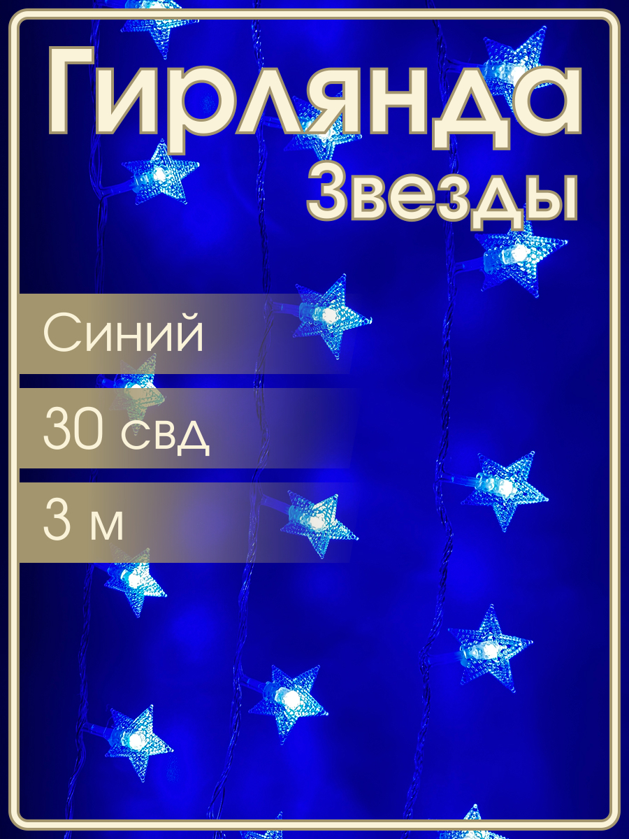 Гирлянда 30 свд, 3 метра, звезды, синяя