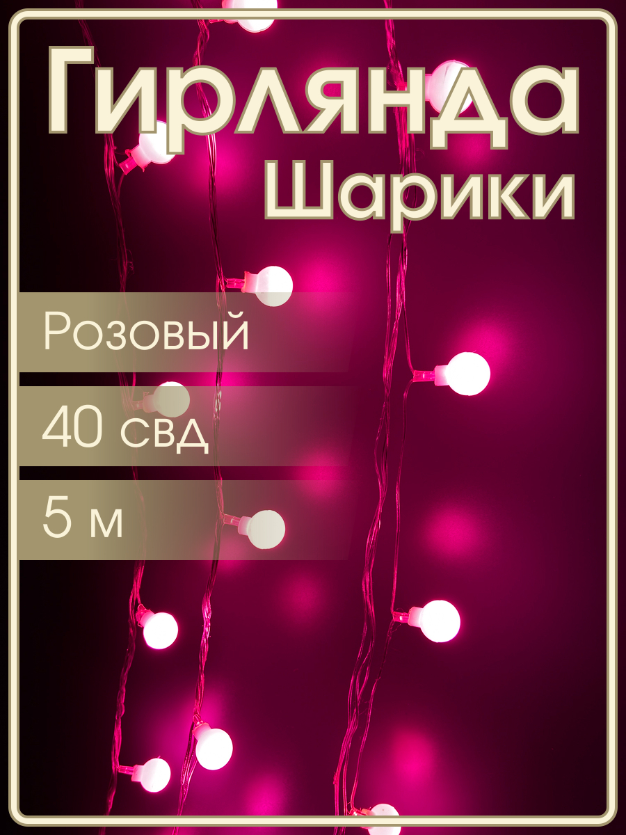 Гирлянда 40 свд, 5 метров, шарики, розовое свечение