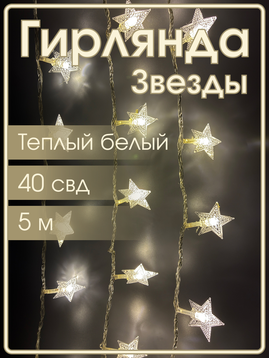 Гирлянда 40 свд, 5 метров, звезды, теплая белая