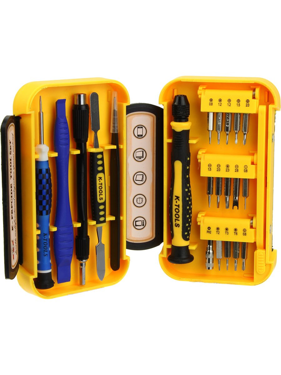В наборе: 15 насадок, пинцет, лопатка металлическая двусторонняя для вскрытия, лопатка пластмассовая для вскрытия, удлинитель отвертки гибкий и тонкая отвертка