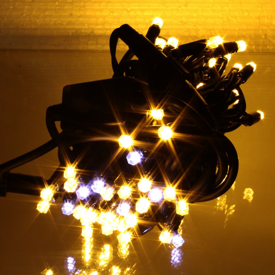 свечение - белый теплый свет, через каждый 10 светодиодов 1 светодиод - мигающий голубой.