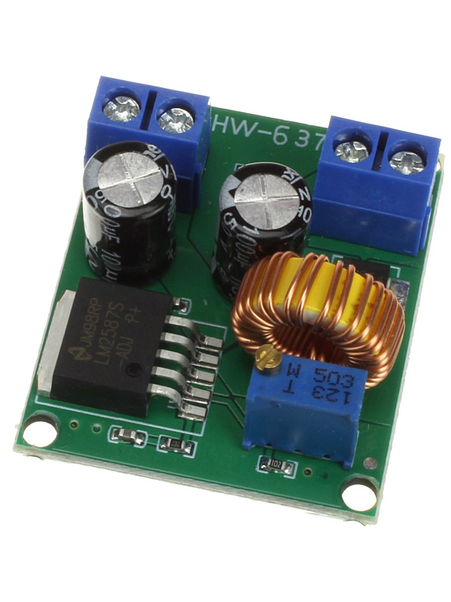 Повышающий преобразователь поднимает напряжение до 60В. На плате стабилизатора LM2587S есть подстроечный резистор, с помощью которого можно регулировать выходное напряжение. При помощи винтовых зажимов под отвертку, можно подключить к преобразователю входные и выходные провода. Благодаря высокому КПД, стабилизатор HW-637 почти не греется и не нуждается в радиаторе охлаждения. Для удобства крепления, на плате есть 4 отверстия под винт.