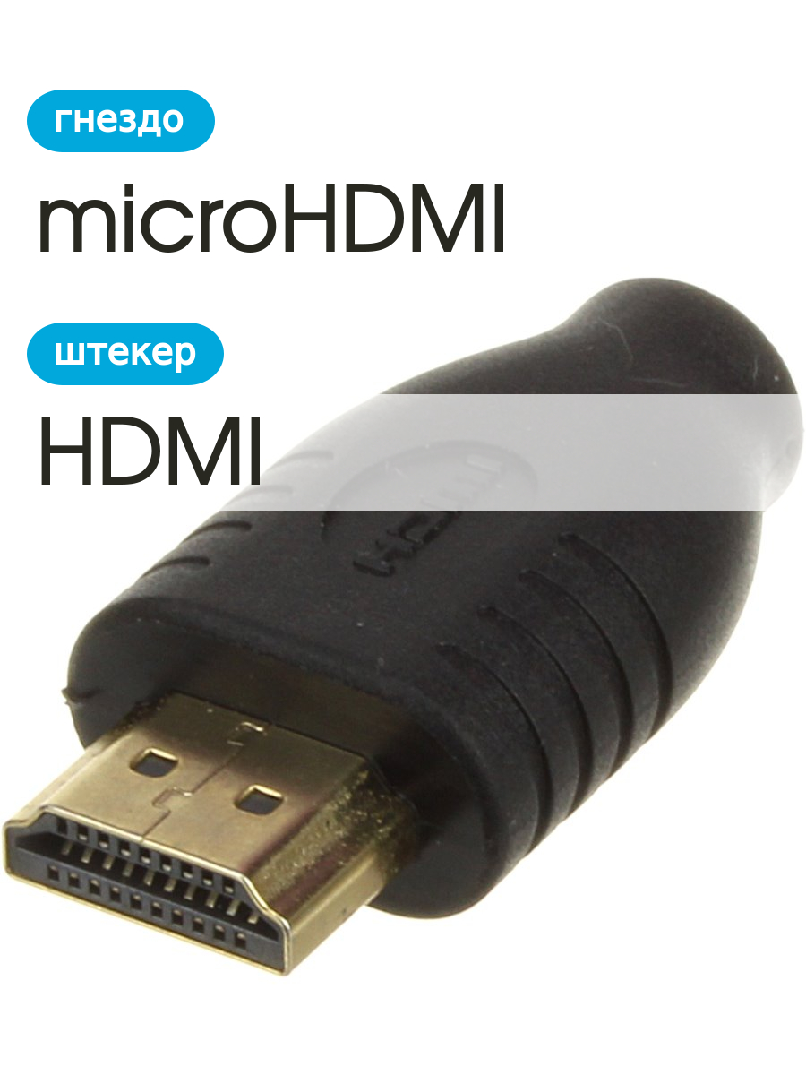 ПЕРЕХОДНИК гнездо microHDMI - штекер HDMI прямой предназначен для удлинения разъёма кабеля HDMI, пропуская через себя цифровые видеоданные высокого разрешения и многоканальные цифровые аудиосигналы с защитой от копирования.