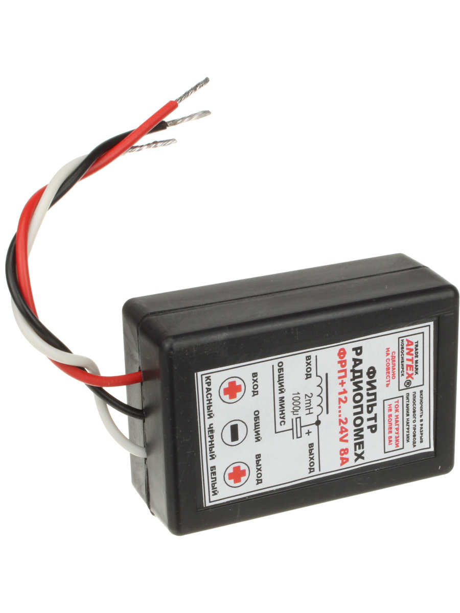 Фильтр включается в разрыв питания нагрузки. Разрывается плюсовой провод питания нагрузки. Плюсу питания (вход) соответствует красный провод. Минусу питания соответствует общий синий или черный провод. Провода фильтра красный и синий (черный) нужно соединить, соблюдая полярность, с проводами бортсети. Белый провод нужно соединить, соблюдая полярность, с проводом или клеммами питания нагрузки.