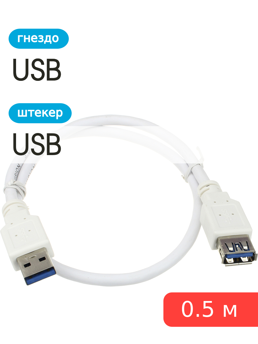 Шнур USB-USB(G) 0.5м USB3.0 прорезиненный, белый