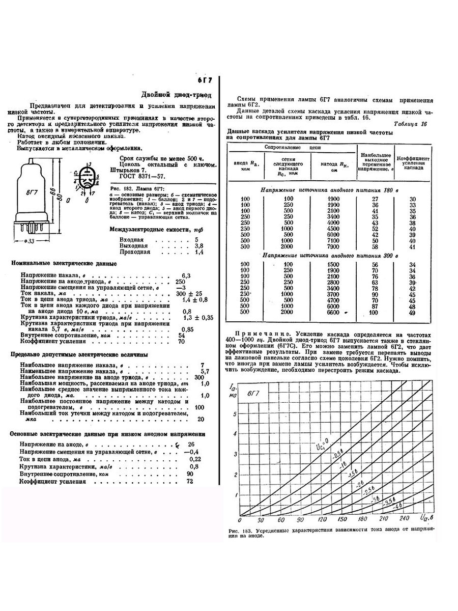 6Г7 двойной диод - триод предназначен для детектирования и усиления напряжения низкой частоты. относится к разделу электровакуумных приборов и ламп различного назначения. По конструкции состоит из вакуумно-герметичной, жесткой оболочки, внутри которой отсутствует кислород.