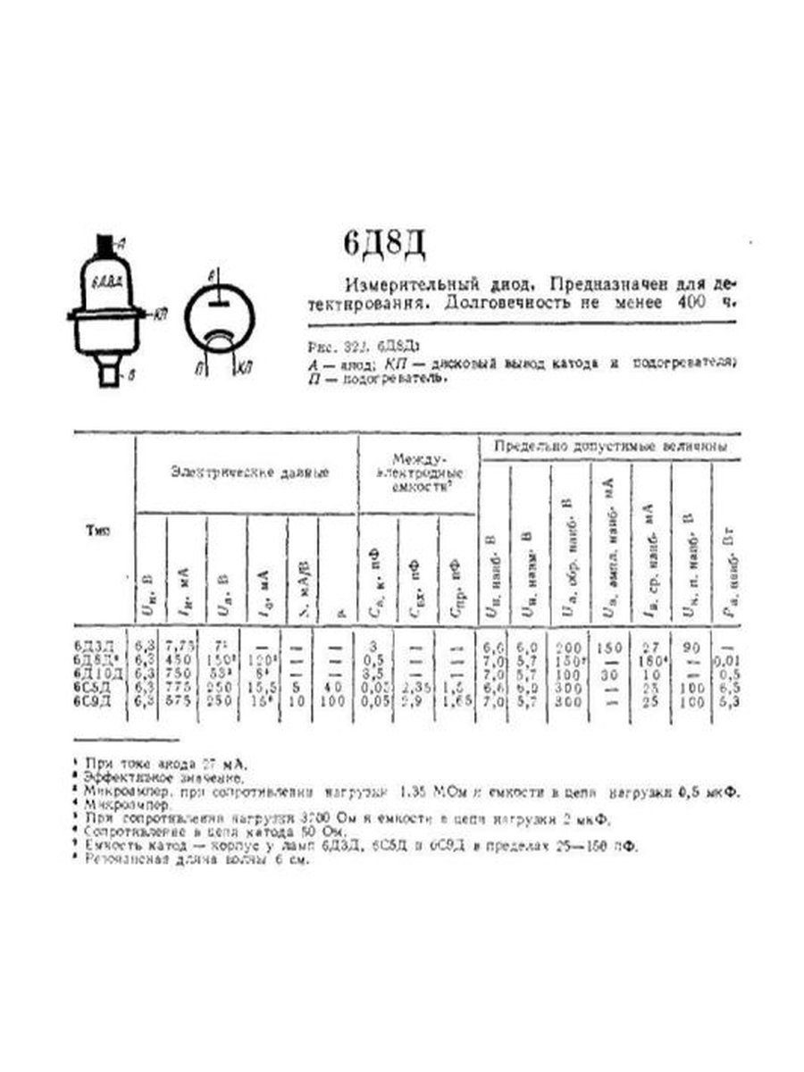 6Д8Д высокочастотный детекторный диод. Предназначен для индикации или измерения мощности СВЧ генеpатоpов. относится к разделу электровакуумных приборов и ламп различного назначения. По конструкции состоит из вакуумно-герметичной, жесткой оболочки, внутри которой отсутствует кислород.