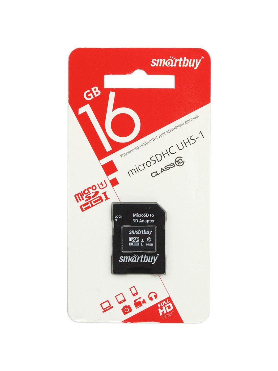 Карта памяти 16GB MicroSDHC SmartBuy, с адаптером